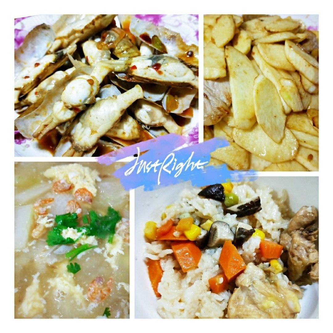 爆炒蛏子,清炒茭白,冬瓜海米汤,香菇鸡块焖饭