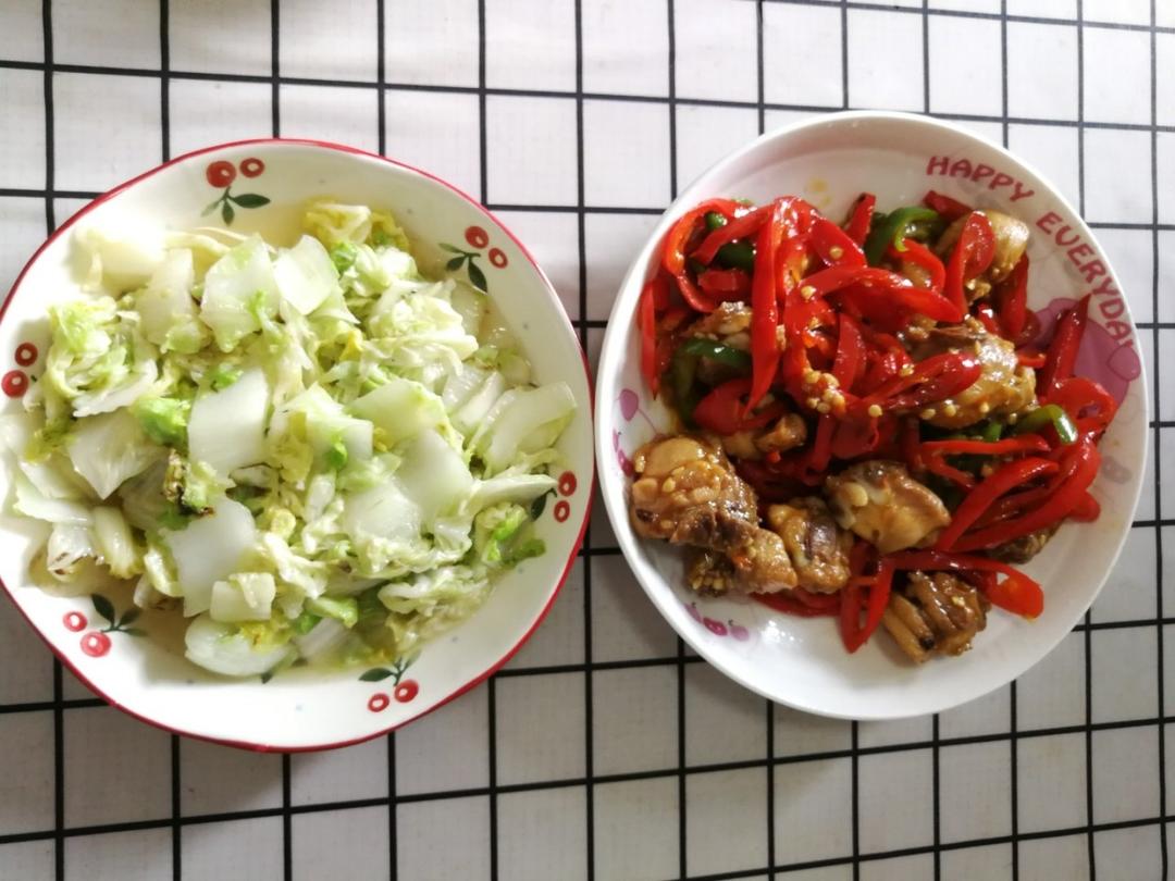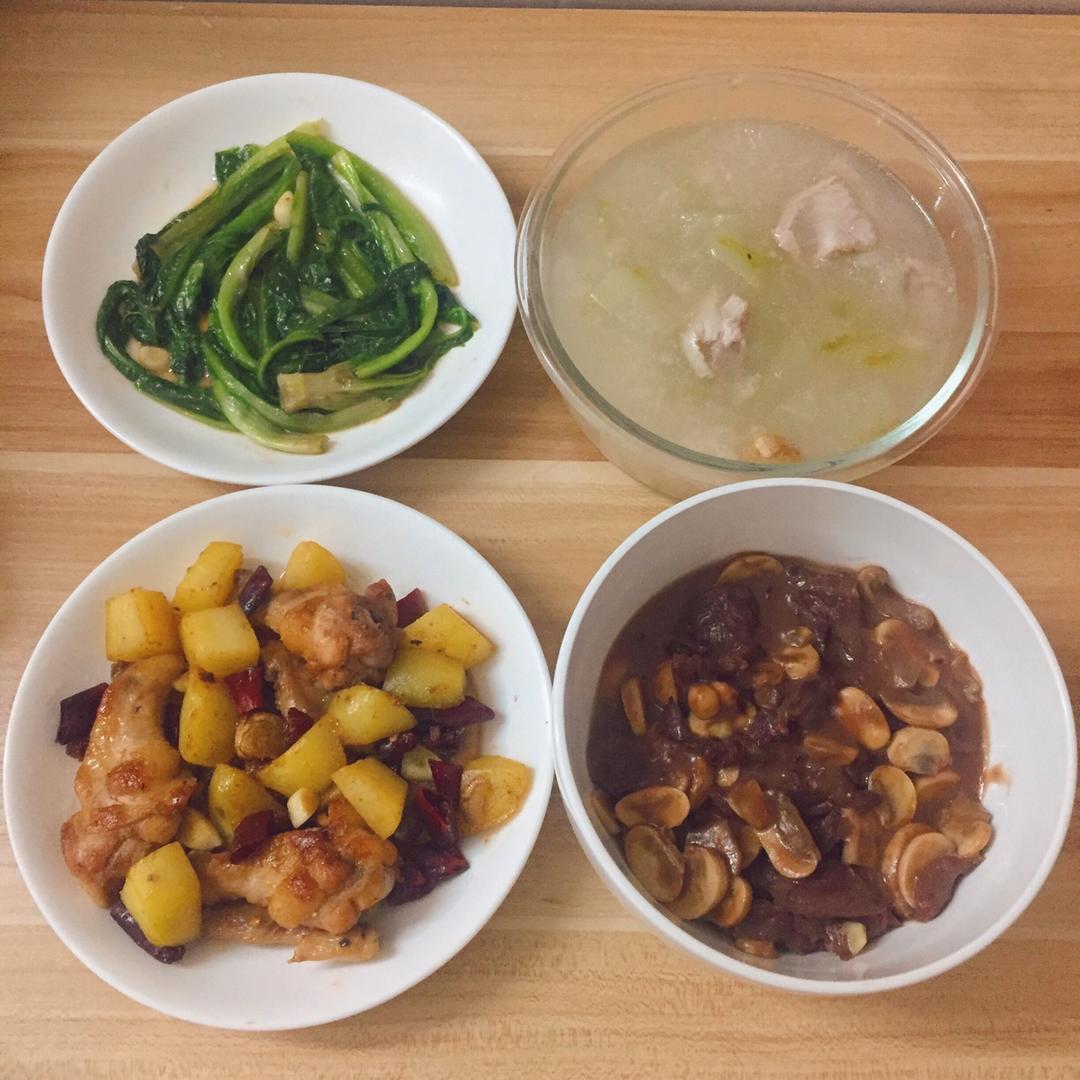辣子鸡+蘑菇牛肉+清炒油麦菜+冬瓜薏米瘦肉汤