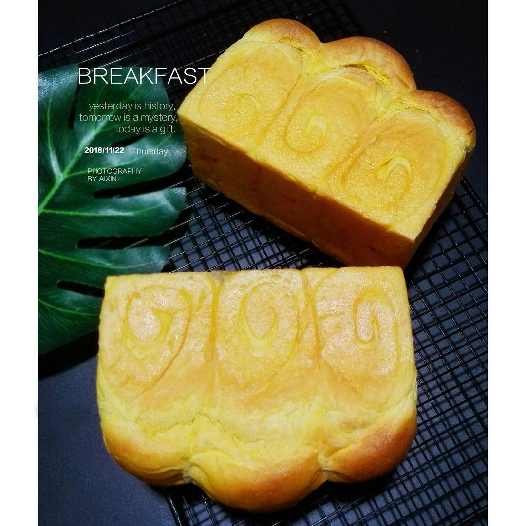 按配方另加50克老面做成了250克土司两个,南瓜泥用到130克,面团有点湿软,下回减南瓜泥或者蛋液。锡纸没盖好,顶部烤黑...