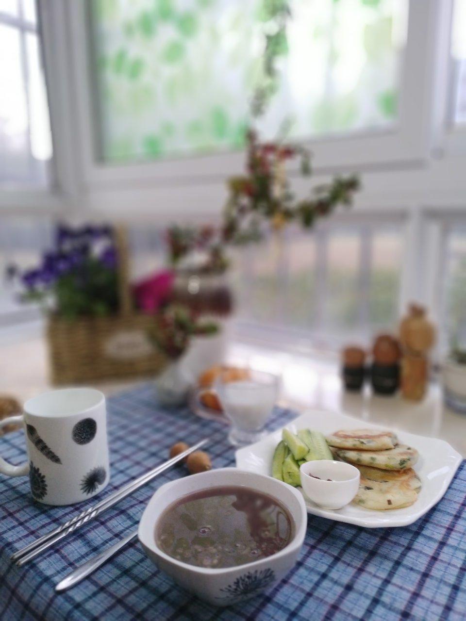 葱油饼,杂粮粥。