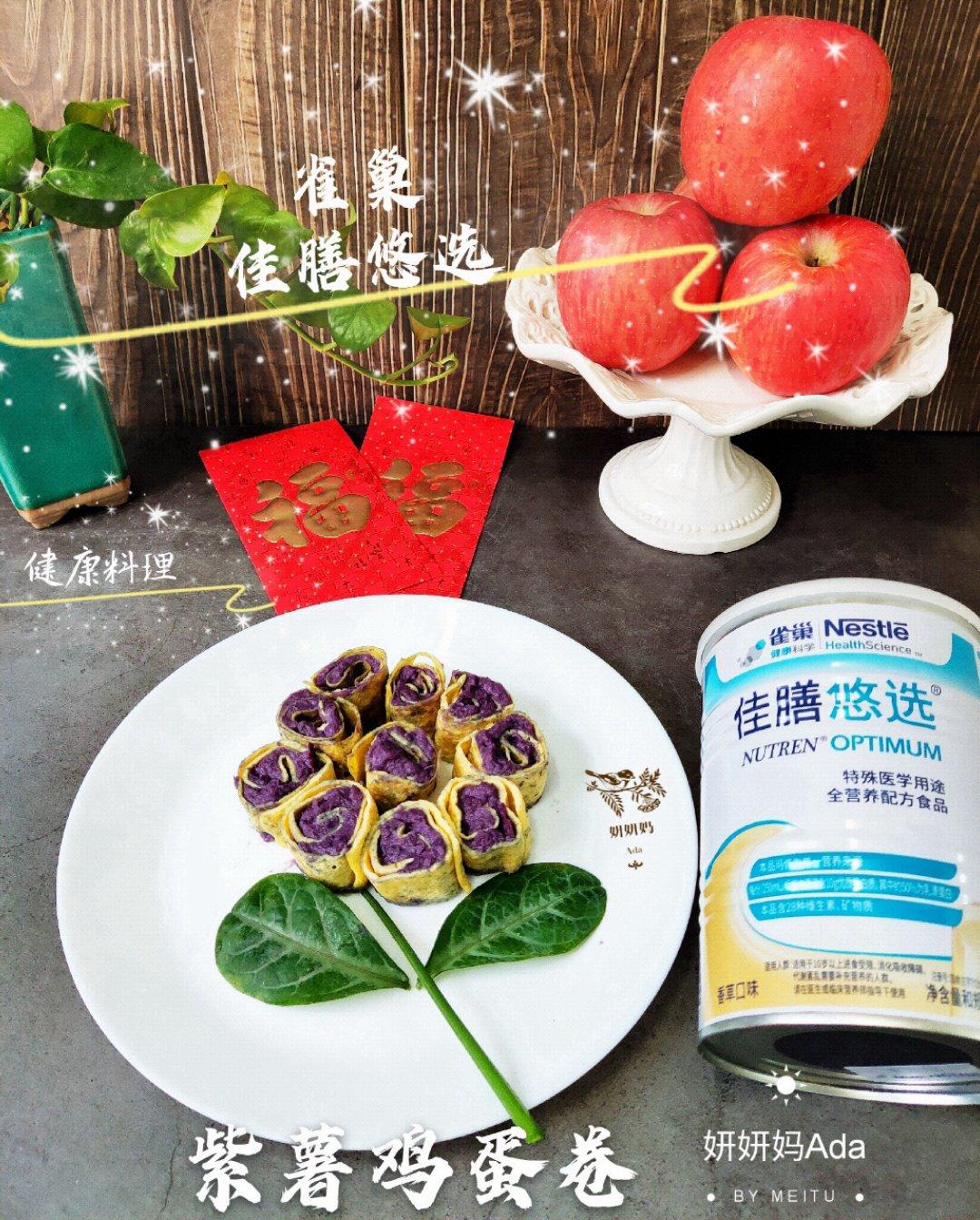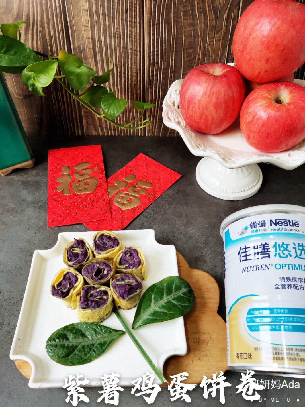 紫薯富含丰富的纤维素和花青素,用来制作煎蛋饼卷,再加入香草味的雀巢佳膳悠选全营养配方粉,令煎蛋饼卷更营养均衡还带着香草气...