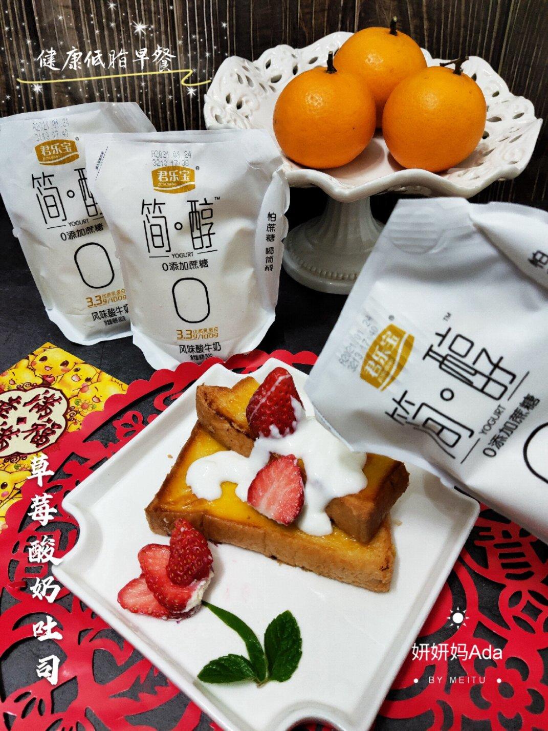 吐司片加入草莓然后淋上简醇酸奶,快手美味低脂健康又营养好吃👍
