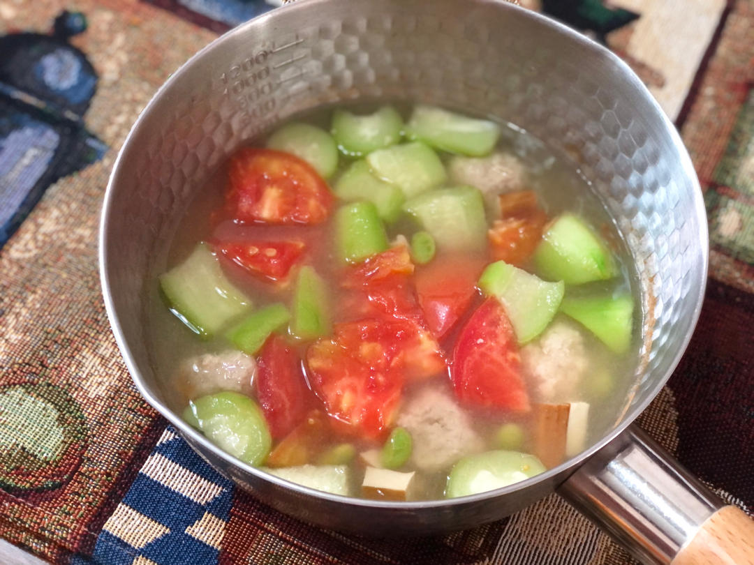 香干番茄丝瓜毛豆肉丸汤