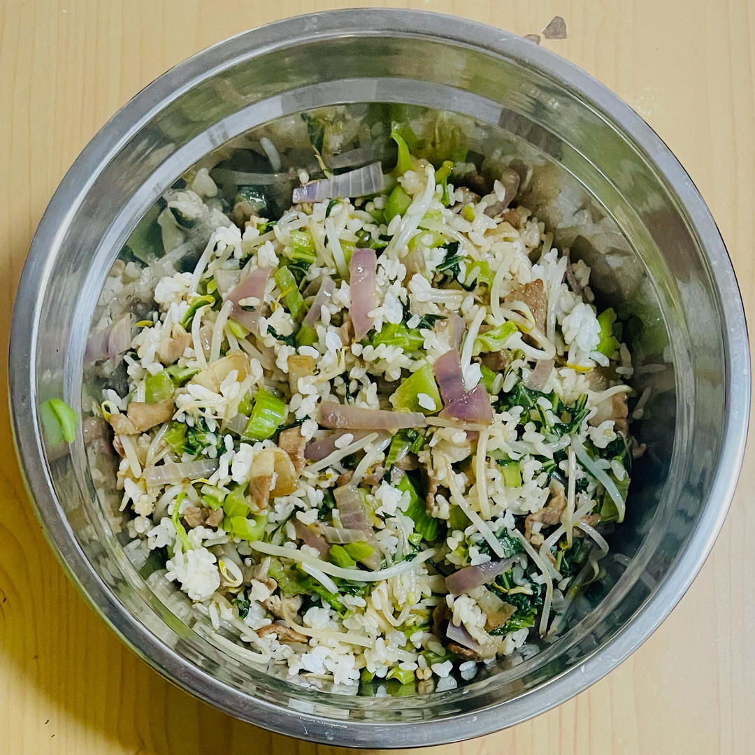 五花肉盖菜炒饭。五花肉用酱油白糖腌渍30分钟备用,盖菜切丝焯水去苦味,洋葱一层切丝,豆芽切段。米饭蒸熟备用。锅热油热下五...