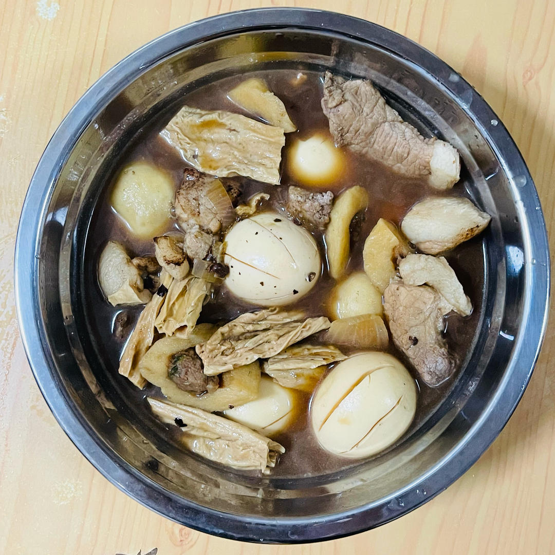 啤酒卤肉蛋。猪后腿肉切块加酱油味精糖腌渍、准备豆豉➕姜片➕洋葱片➕八角、腐竹泡开切块、鱼丸切块、水煮鸡蛋去壳之后用刀划开...