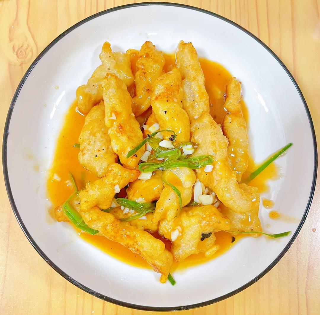 锅包肉。里脊肉切条、刀拍加入盐和油腌渍,捞起控水,土豆粉搞成非牛顿液体状态挂糊。调糖醋汁(两勺盐两勺酱油一点点盐巴,一点...