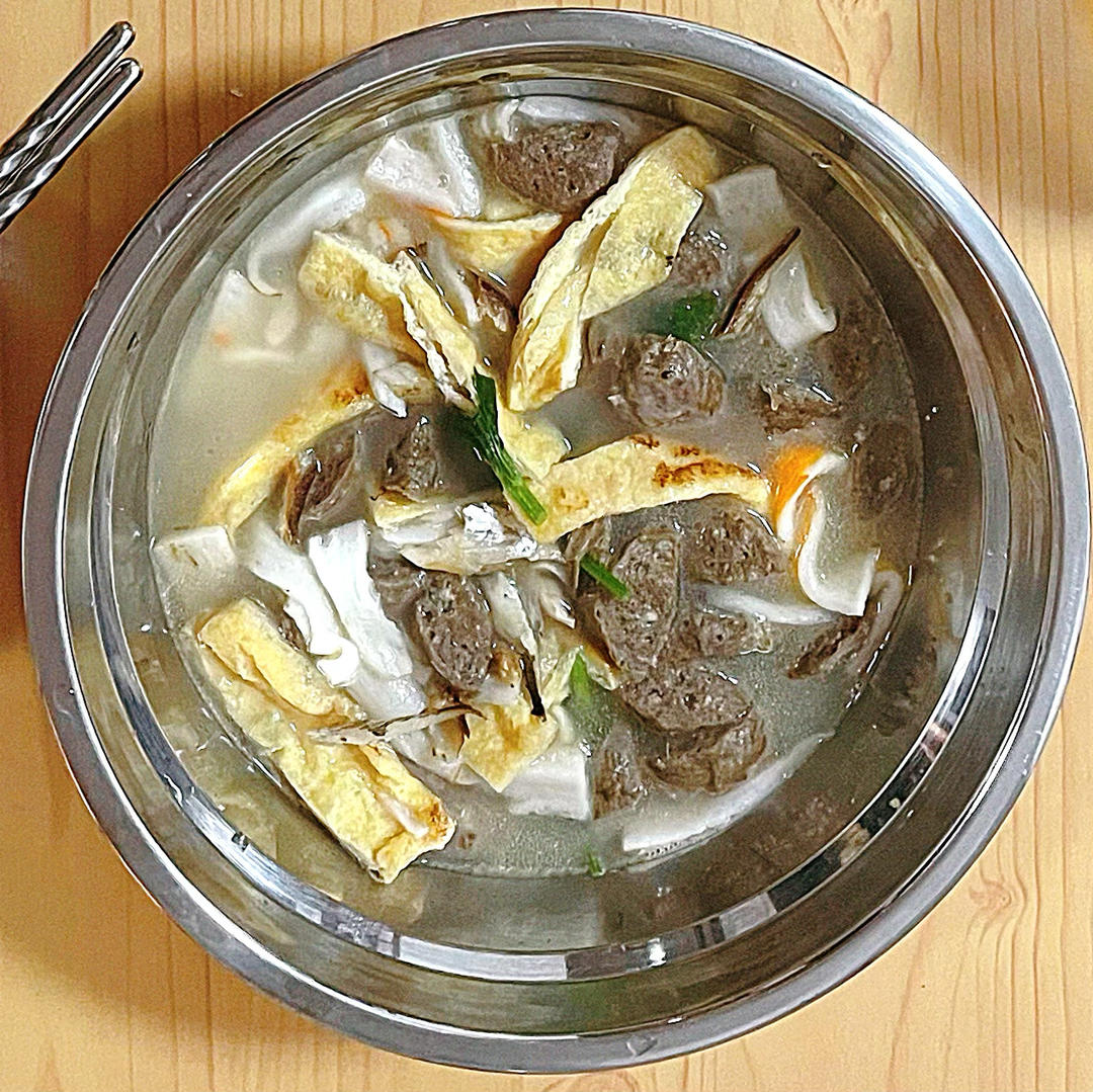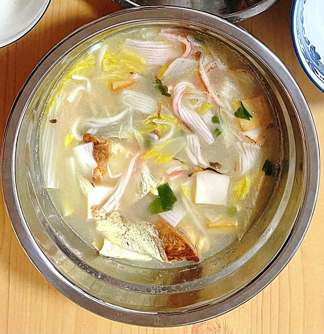 杂素汤。牛肉丸切块,豆腐皮切条,蟹肉棒竖切撕成条,咸鱼掰开去骨。锅热油热下牛肉丸、豆腐皮炒熟,加味精。再加水煮开加蟹肉棒...