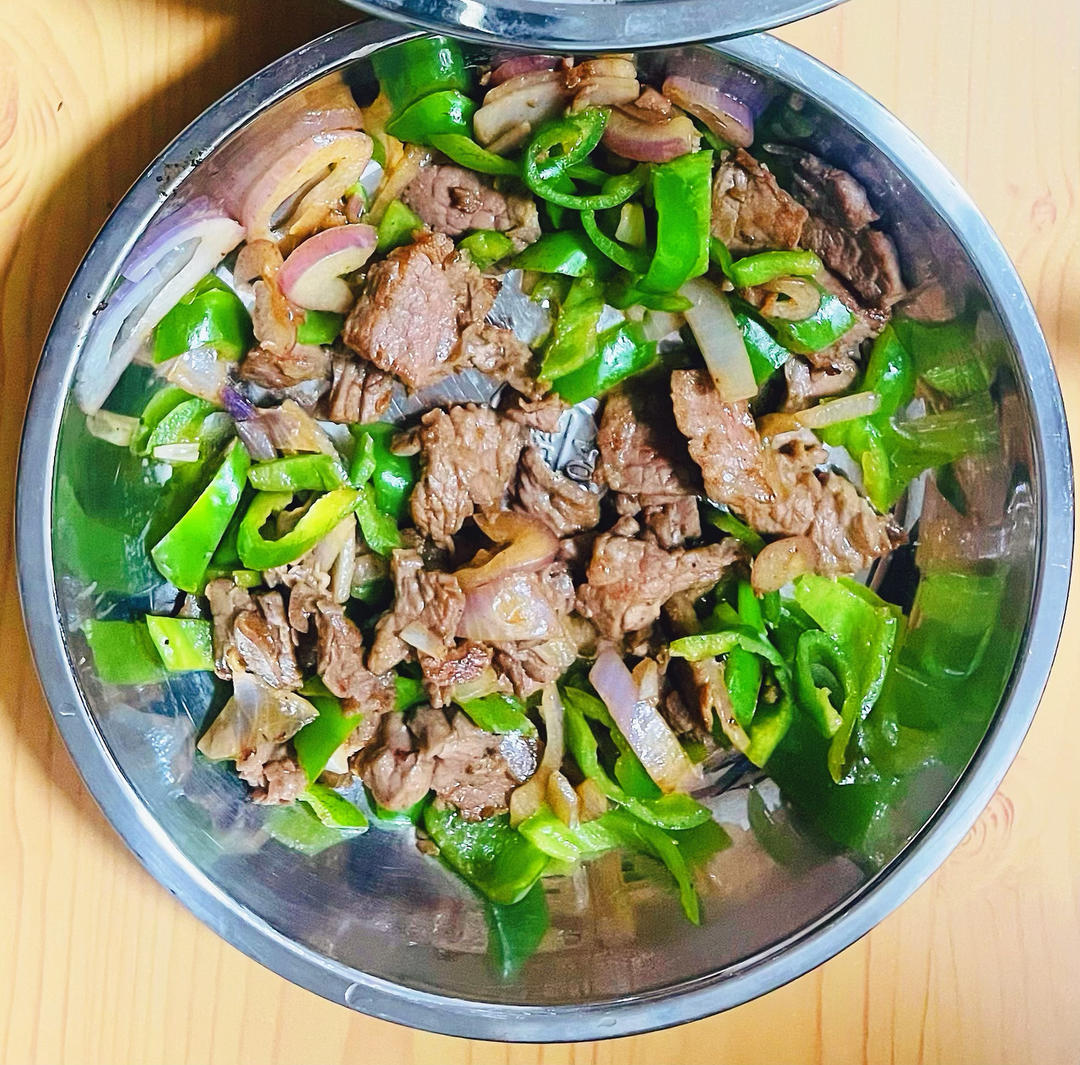 牛肉炒青尖椒。新鲜牛肉切薄片,加酱油盐巴味精地瓜粉小苏打腌渍,青尖椒去籽去辣筋,锅热油热下牛肉爆香再加洋葱和辣椒。很不错...