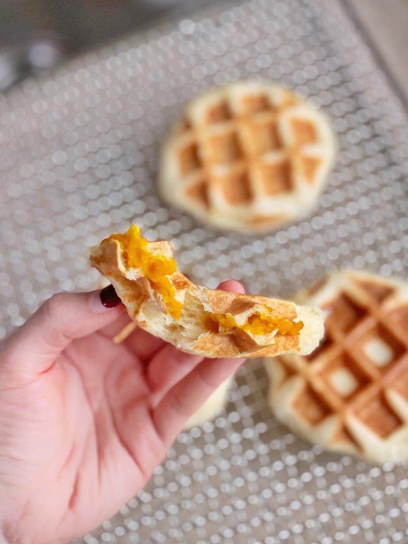 没有加糖,助农买的贝贝南瓜已经很甜了。包在华夫饼里真的好好吃!做了几次了,刚出炉外面脆脆热热,里面酥软。用贝贝南瓜才会这...