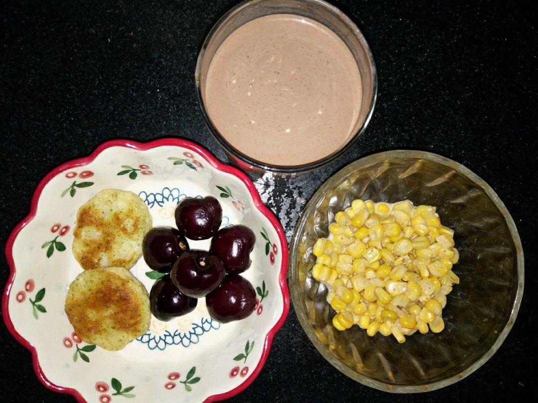 虾饼+玉米沙拉+车厘子+热可可