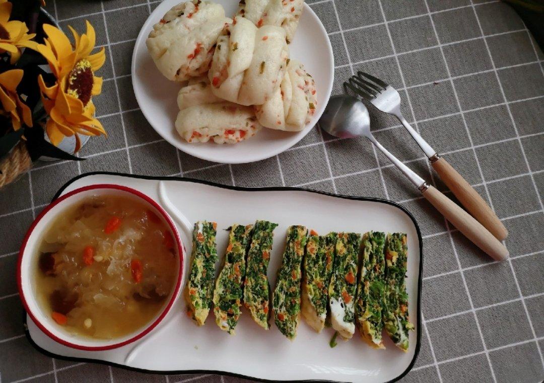 今天的早餐:薏米红枣银耳羹+胡萝卜菠菜鸡蛋糕+火腿葱花卷