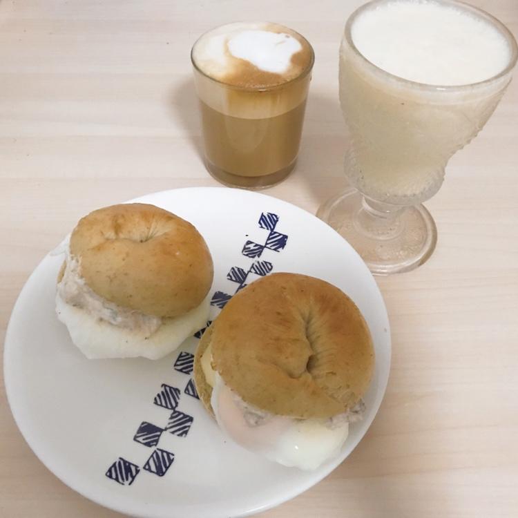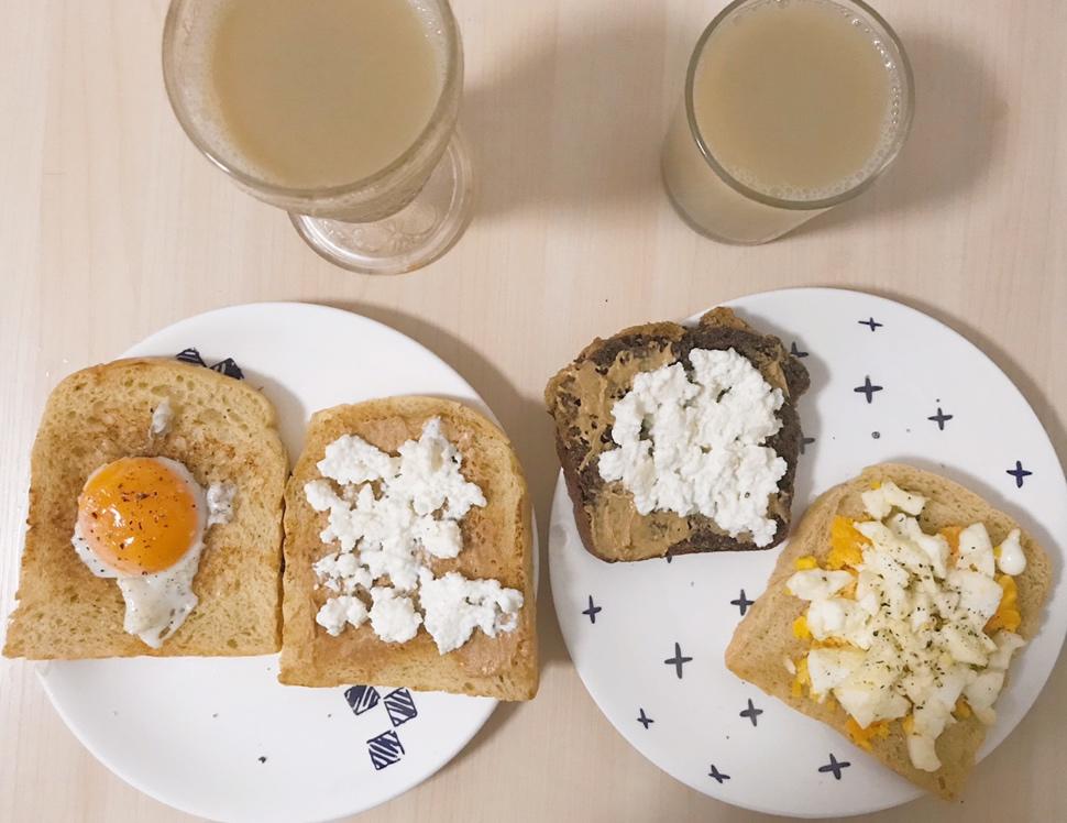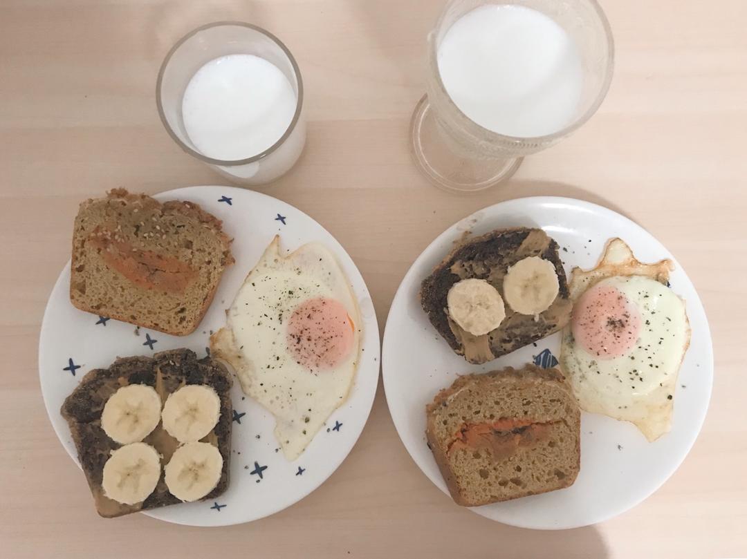 摩卡花生酥快手面包,肉松快手面包,牛奶豆浆,黄油煎蛋