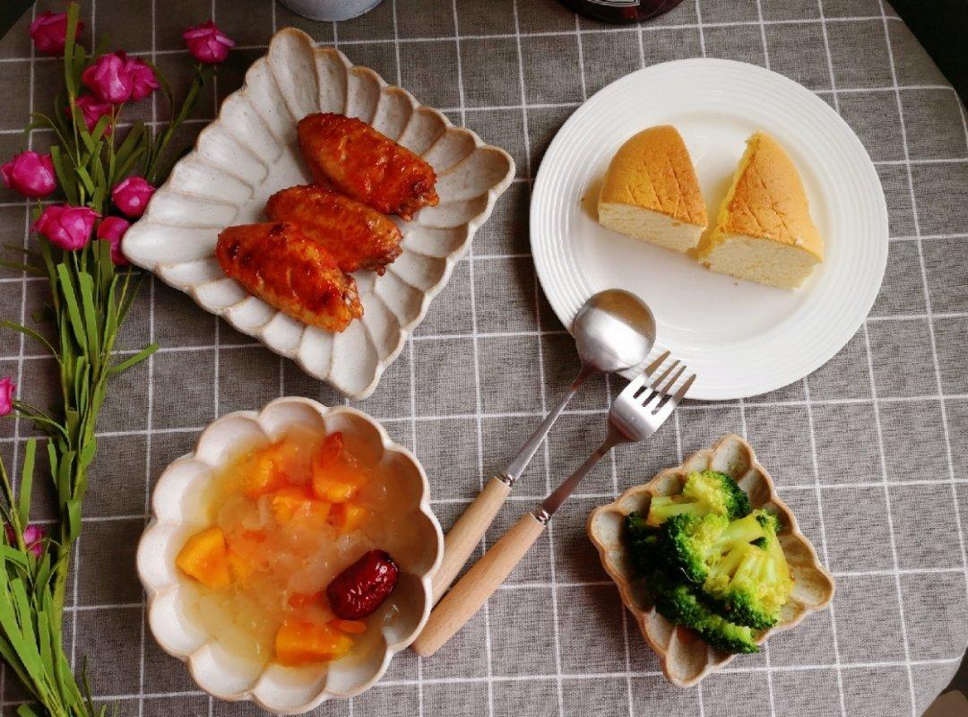今天的早餐:乳酪蛋糕 奥尔良烤翅 木瓜银耳羹 清...