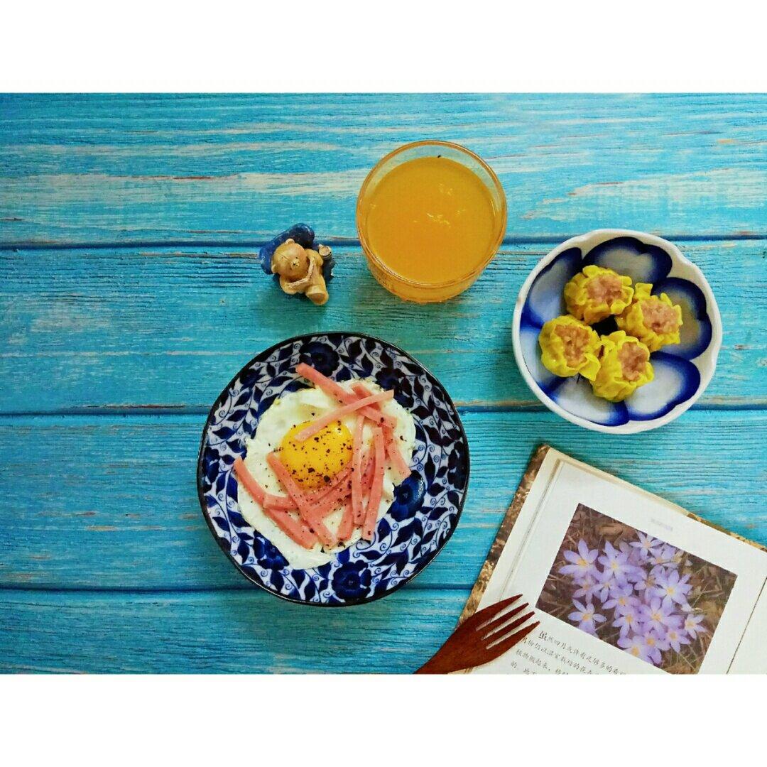 干蒸烧麦+火腿煎蛋+果汁,昨天老默的早餐。有人喜欢365天不重复的早餐,也有人喜欢睡到自...