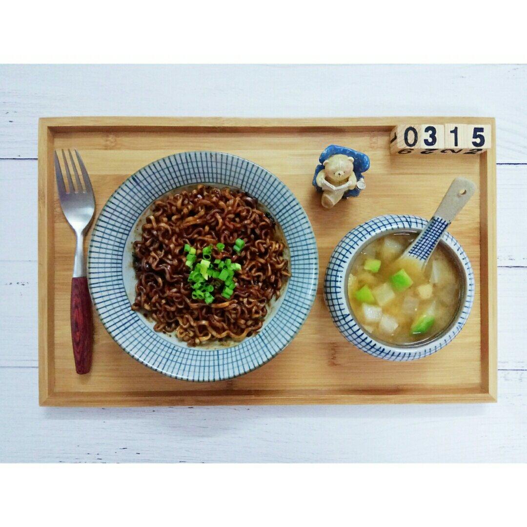 韩式炸酱面+蔬菜味噌汤,一个人的午餐。炸酱面一直都爱吃的,韩式的带点甜味,颜色也偏浓,考...