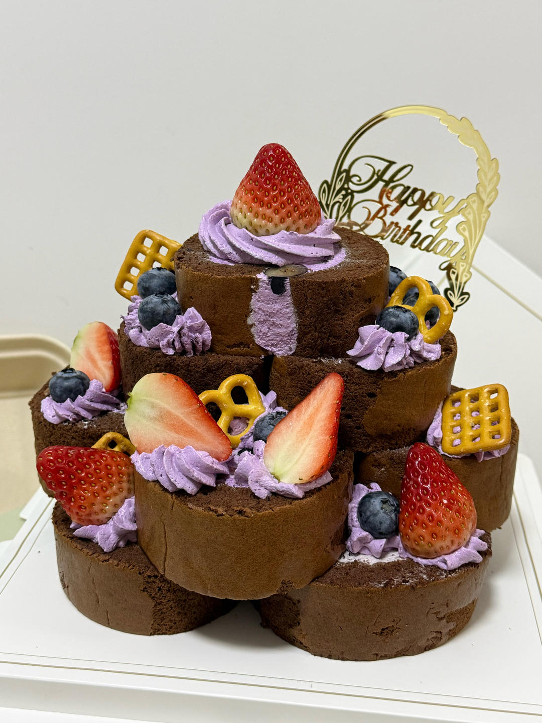 巧克力莓果蛋糕,可可戚风,巧克力奶油,草莓夹心,外铺巧克力开心果甘纳...
