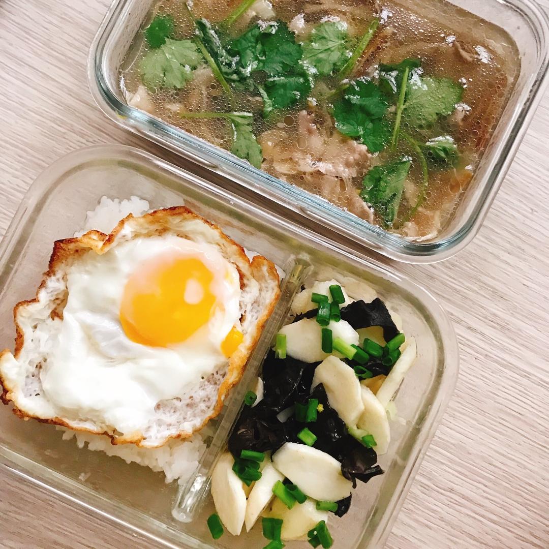 荷包蛋➕淮山炒木耳➕金针菇肥牛汤