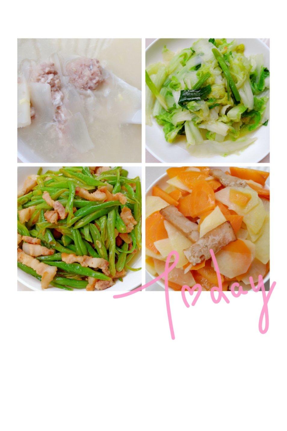 山药肉丸汤,白菜,四季豆炒五花肉,土豆胡萝卜炒肉卷