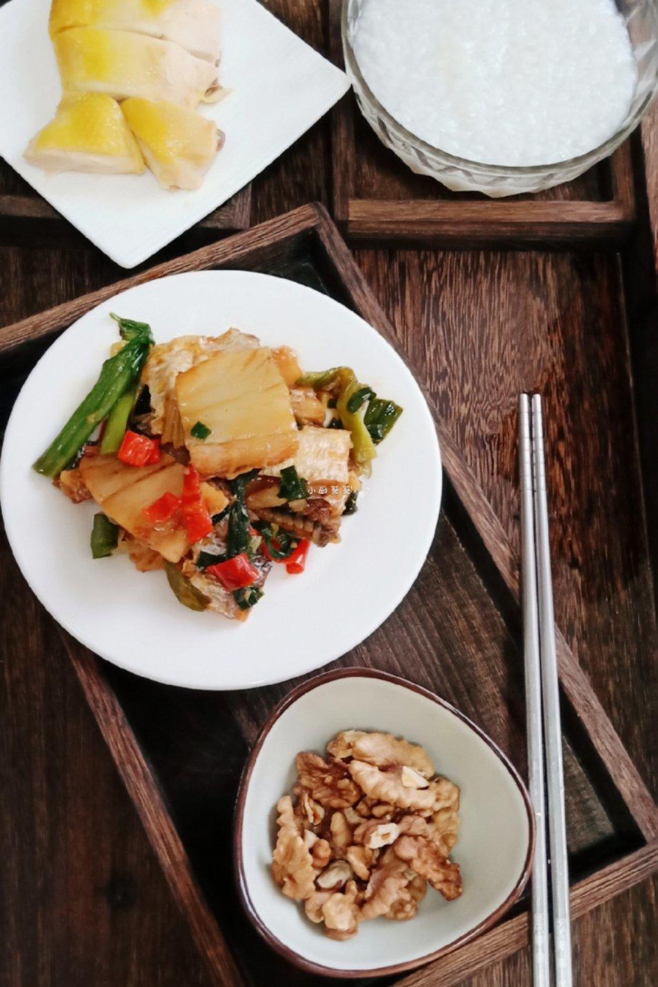 今日早餐:盐焗鸡,黄花鱼干,核桃,粥。