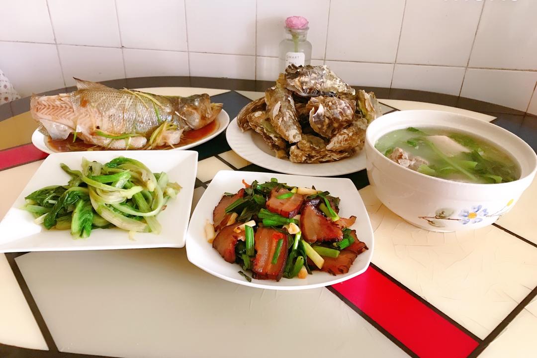 大米糙米黎麦饭,清蒸鲈鱼,蒜苗炒腊肉,清蒸生蚝,清炒凤尾菜,小白菜骨头汤