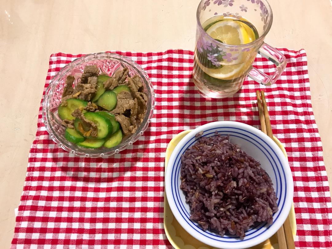 青瓜炒牛肉,米饭是用了红米黑米糙米大米一起煮的,低升糖比较健康