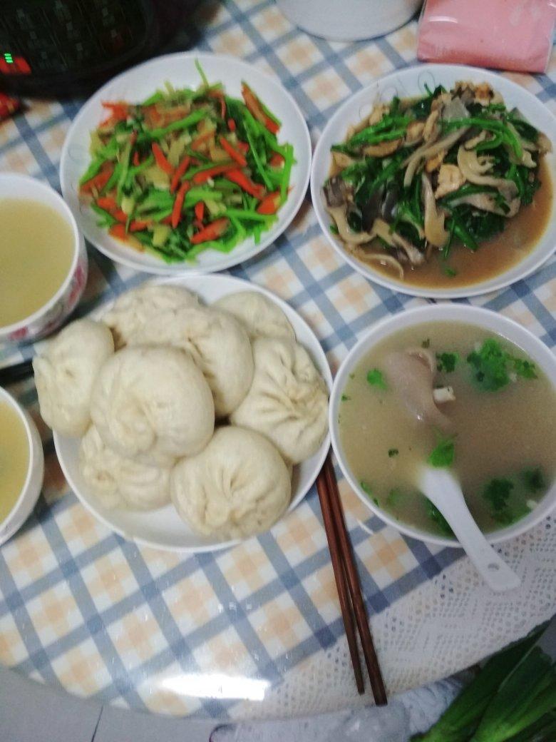 白菜肉包子猪蹄汤。菠菜平菇炒肉茼蒿彩椒炒菜花,