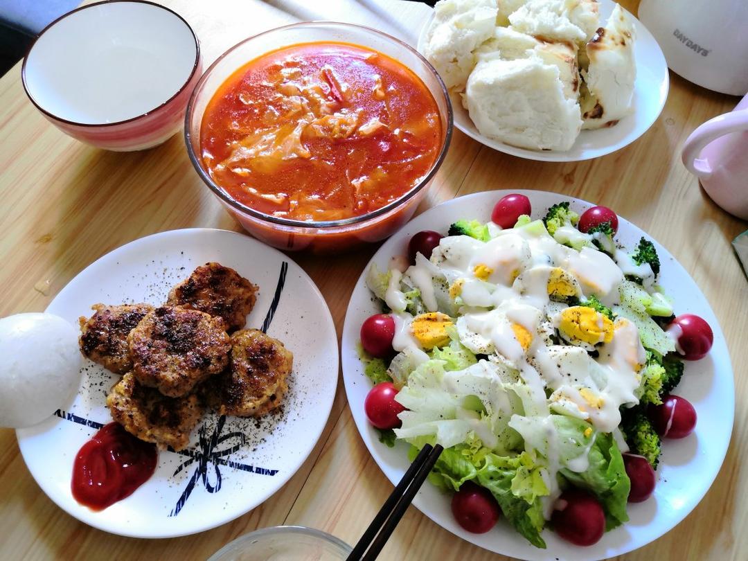 罗宋汤+自制虾饼+沙拉…请忽略馒头哈哈