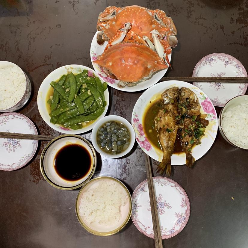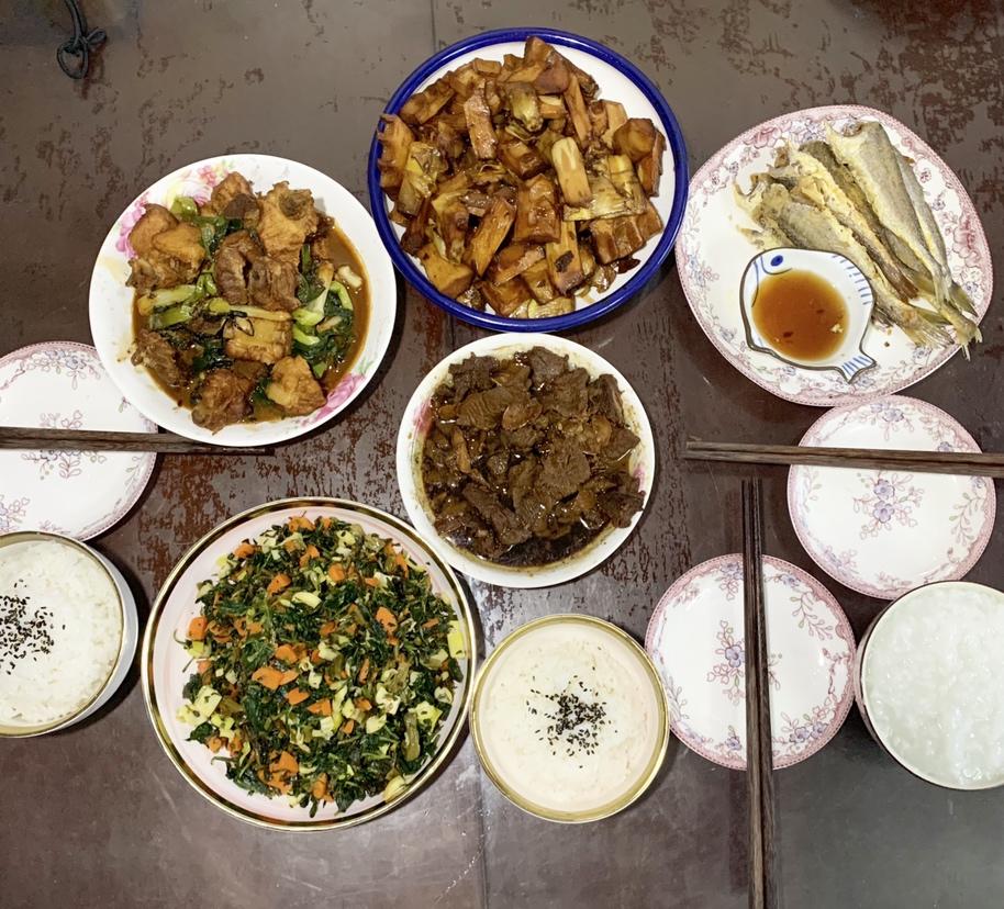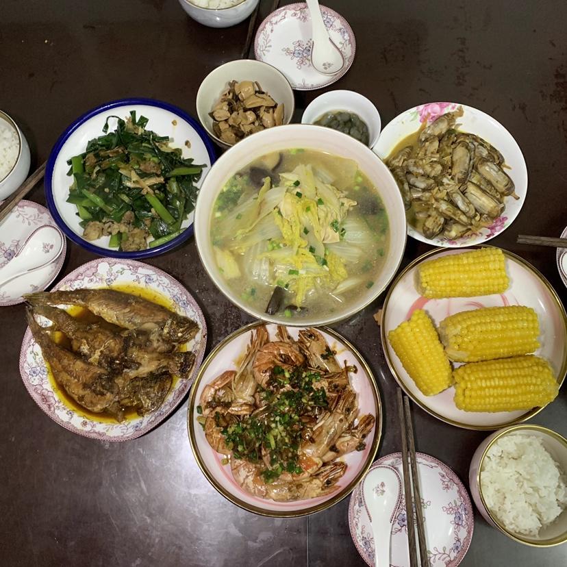 午餐:土豆排骨汤➕猪血炒韭菜➕白菇炒咸菜➕红烧蛏子