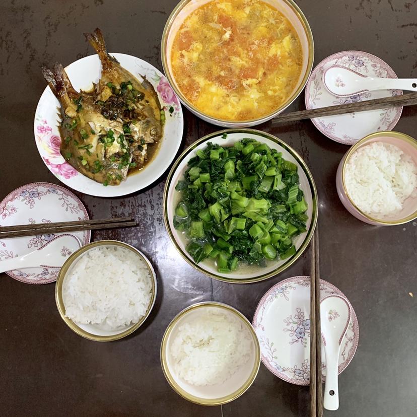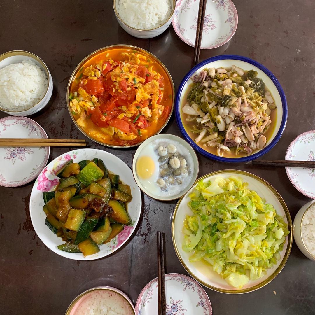 午餐:炒南瓜➕咸菜炒鱿鱼🦑➕番茄🍅炒蛋➕包心菜炒虾皮