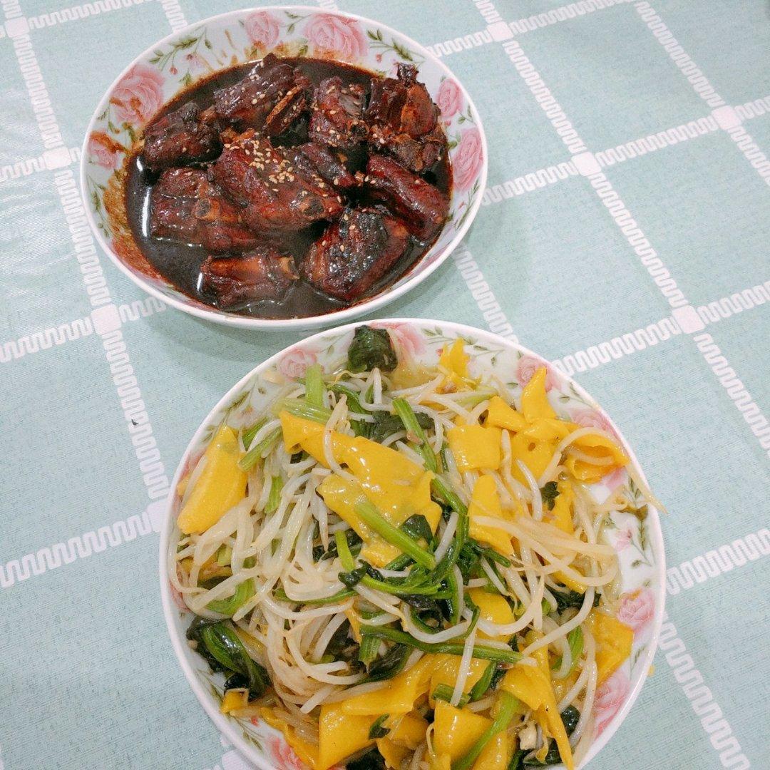因为糖宝的原因导致排骨有点糊锅,还好没有糊的太厉害,味道还是杠杠的👍️其他是我们这边的特产名字叫清炒...