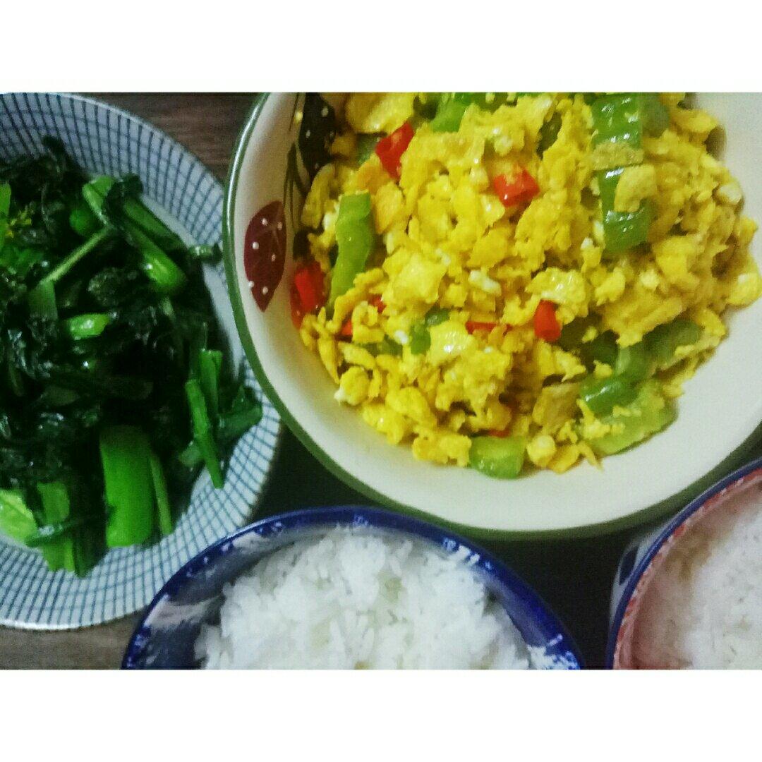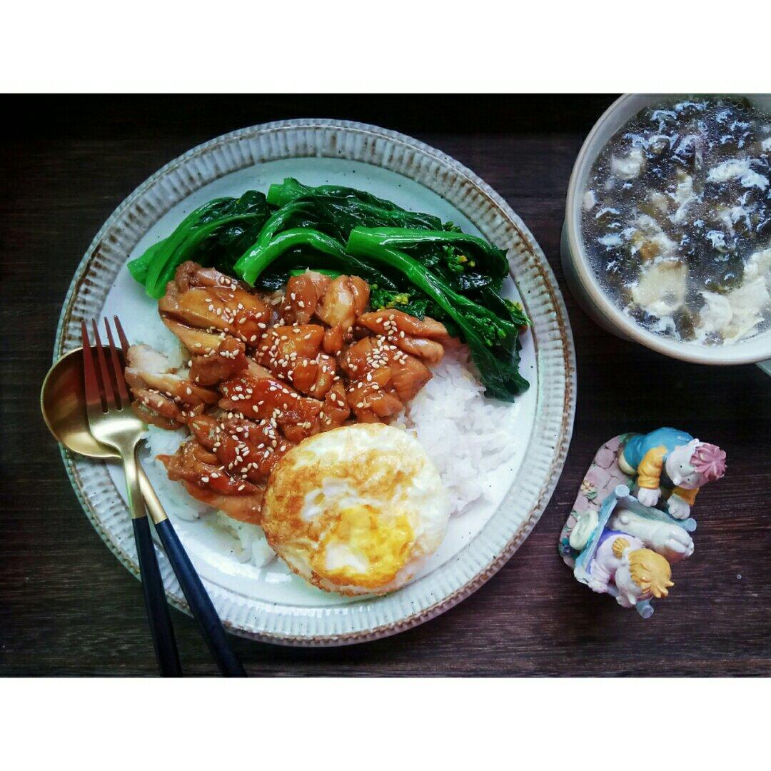 给熙哥准备的照烧鸡腿饭。午餐。两个鸡腿肉,一个荷包蛋,一小把甜菜心,还有一碗紫菜蛋花汤,像从前那样,大快朵颐。2019年...