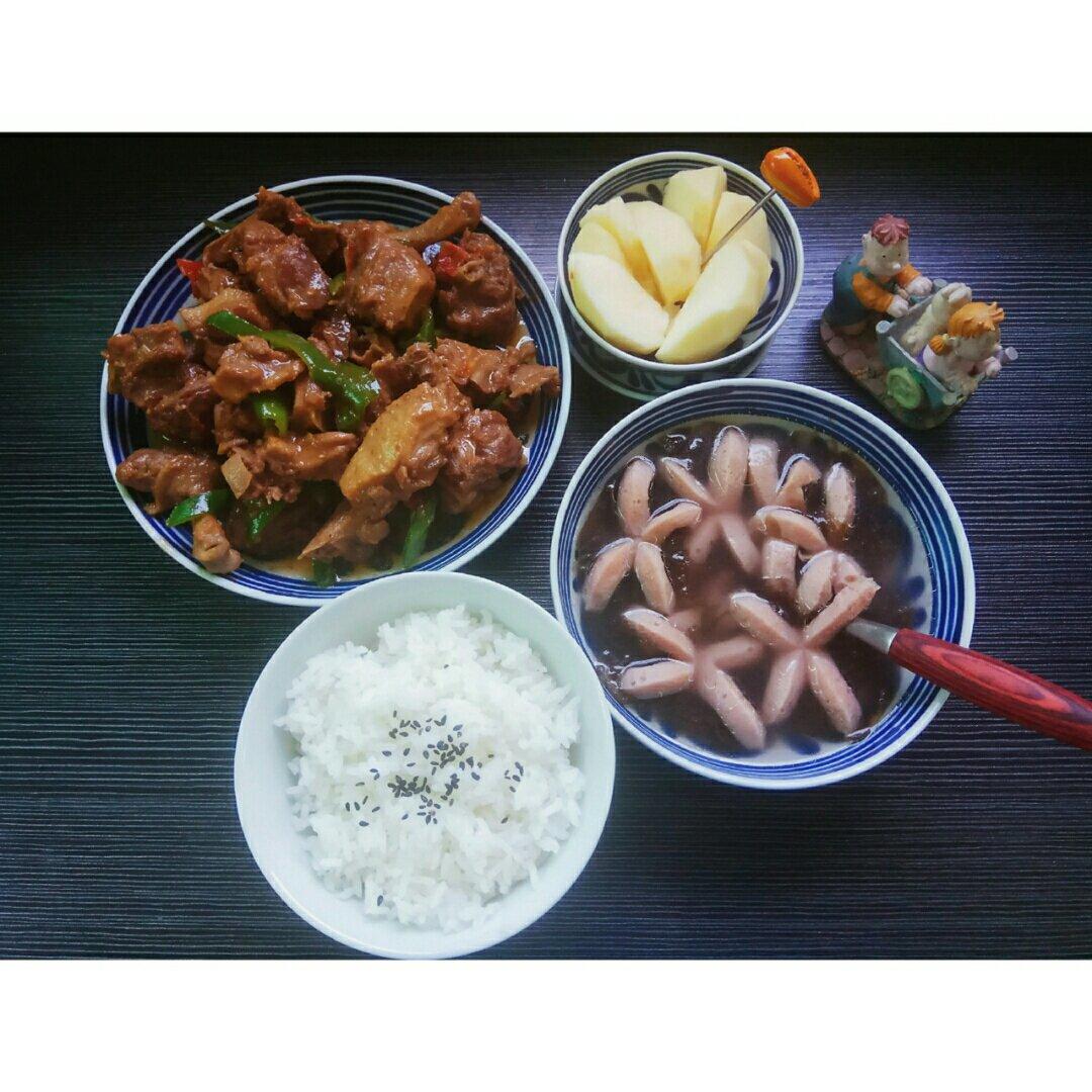 难得娃在家吃饭,可有人偷懒已经一星期没买菜了,连鸡蛋壳都找不见,咋办?冷冻室翻出三个大鸭腿与半袋香肠,再加一个嘎啦小苹果...