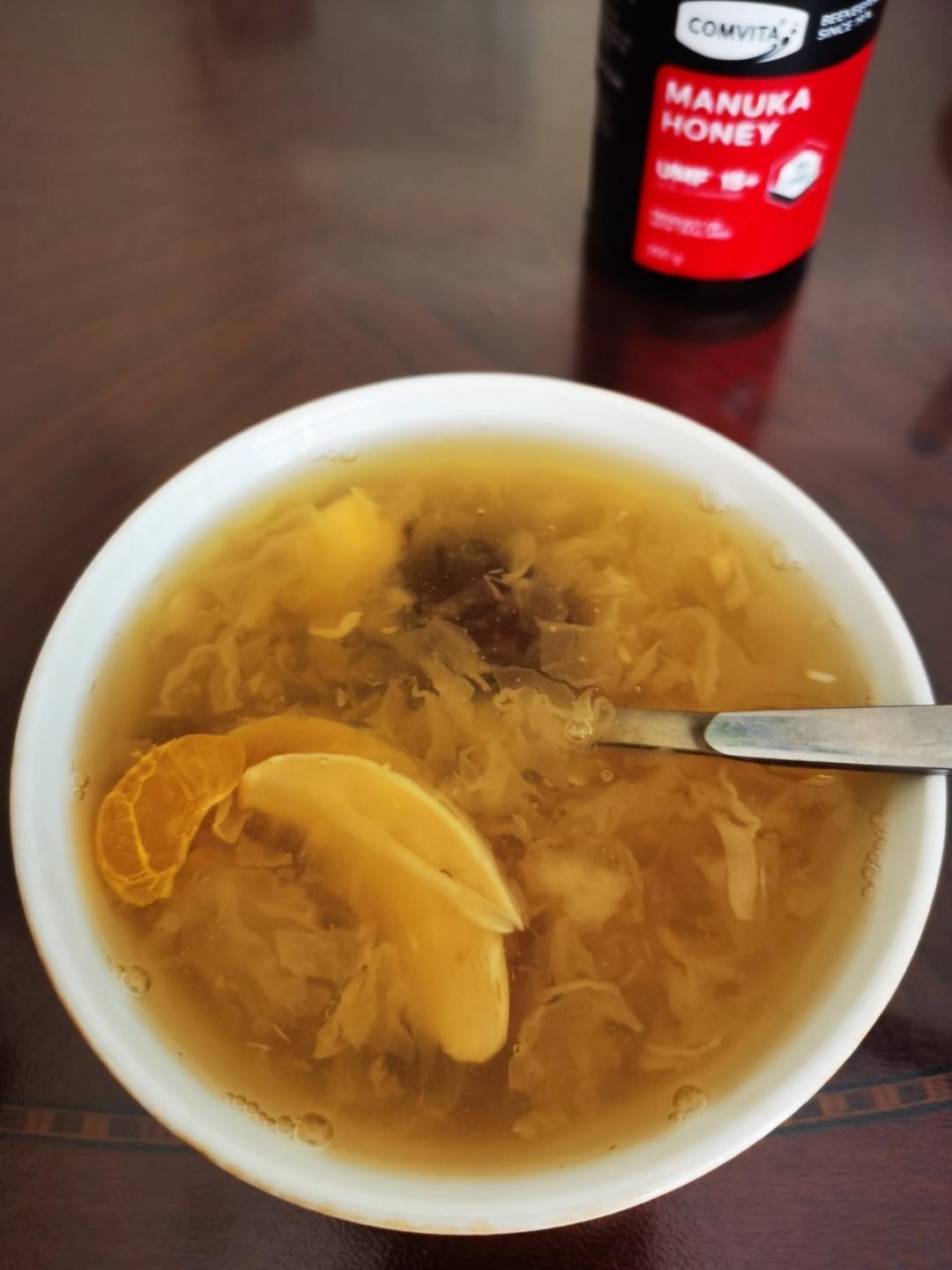 羹加了蜂蜜。银耳、百合软滑稠糯,红枣、葡萄干🍇、小金桔🍊香甜可口😇😇