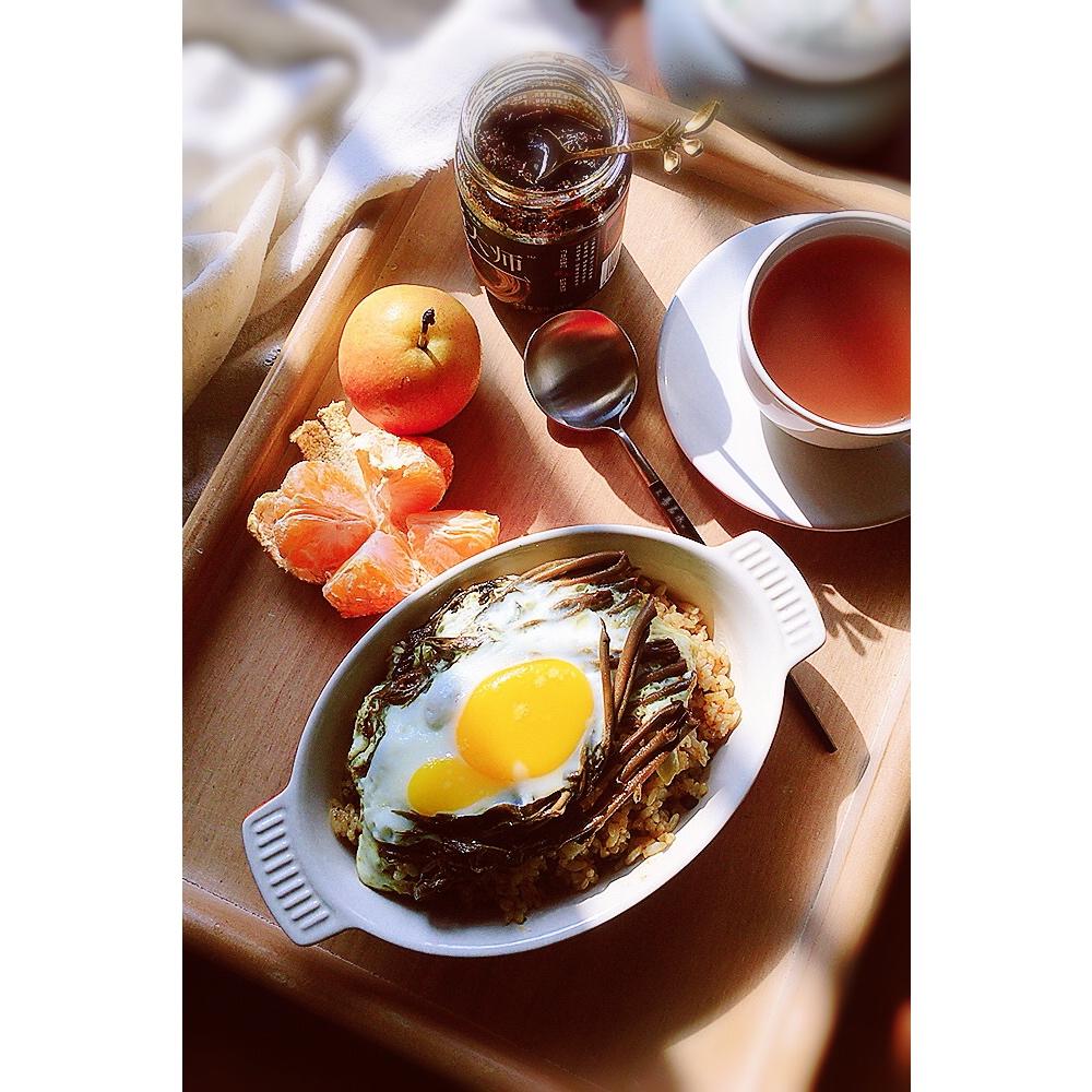 香椿煎蛋炒米饭,放入少许梅菜肉酱麻辣鲜香已光盘哦😌