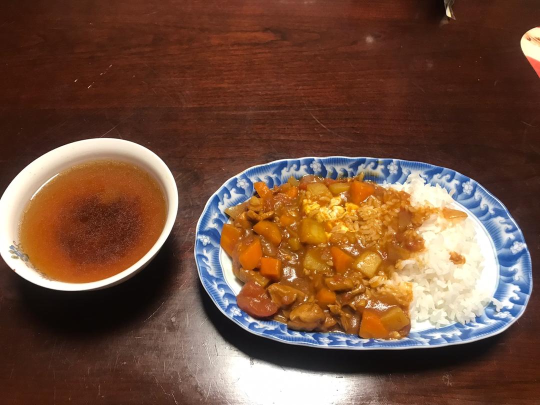 加了土豆也没有加水,就是煮时间相对比较长。等土豆煮透了再加酸奶煮两分钟。自己再炒了个滑蛋妥妥的日式咖喱料理好好吃!