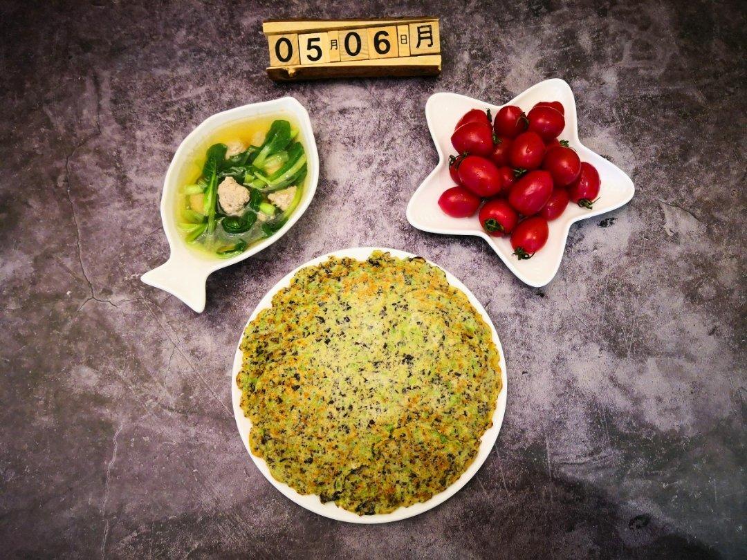 小学生早餐:青菜汆丸子、豆角木耳鸡蛋饼、...
