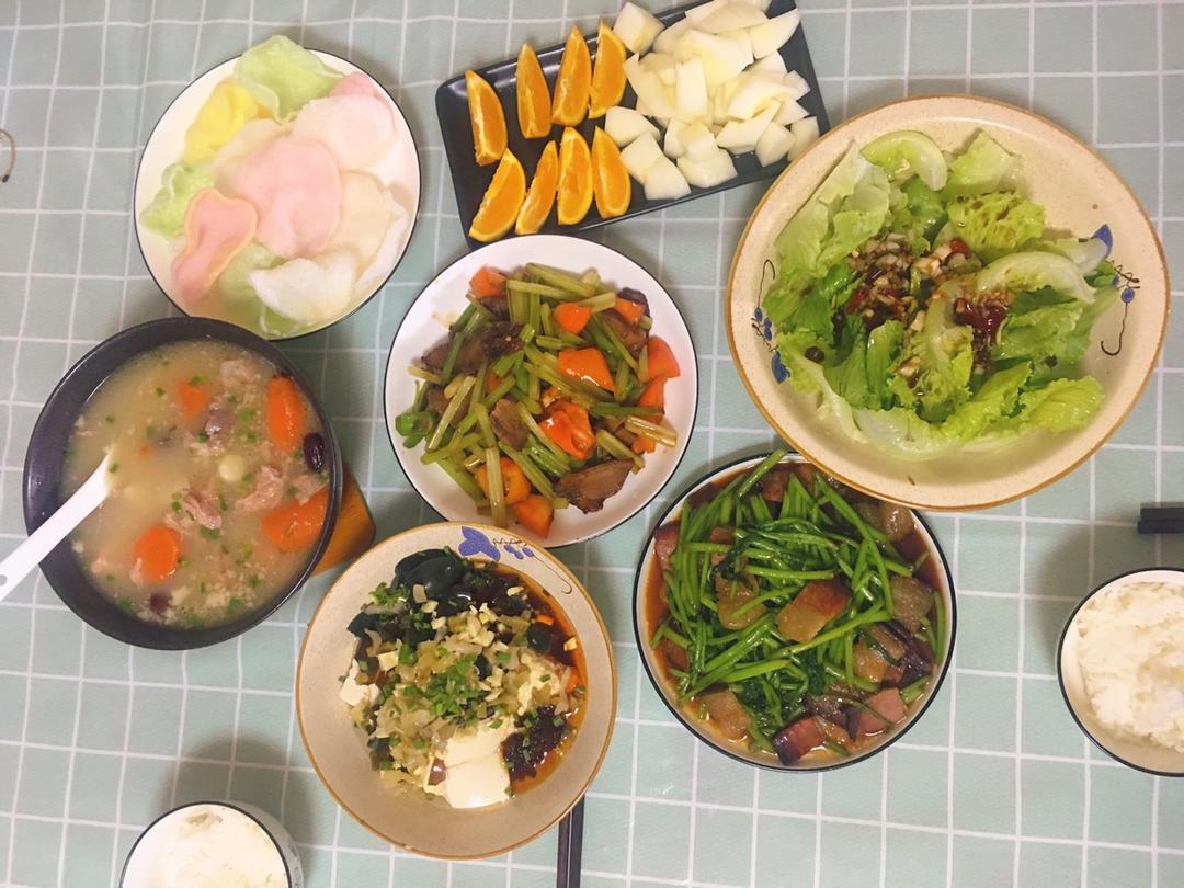 炝拌生菜➕茼蒿炒腊肉➕芹菜炒牛肉➕皮蛋拌豆腐➕山药排骨汤➕炸虾片➕水果