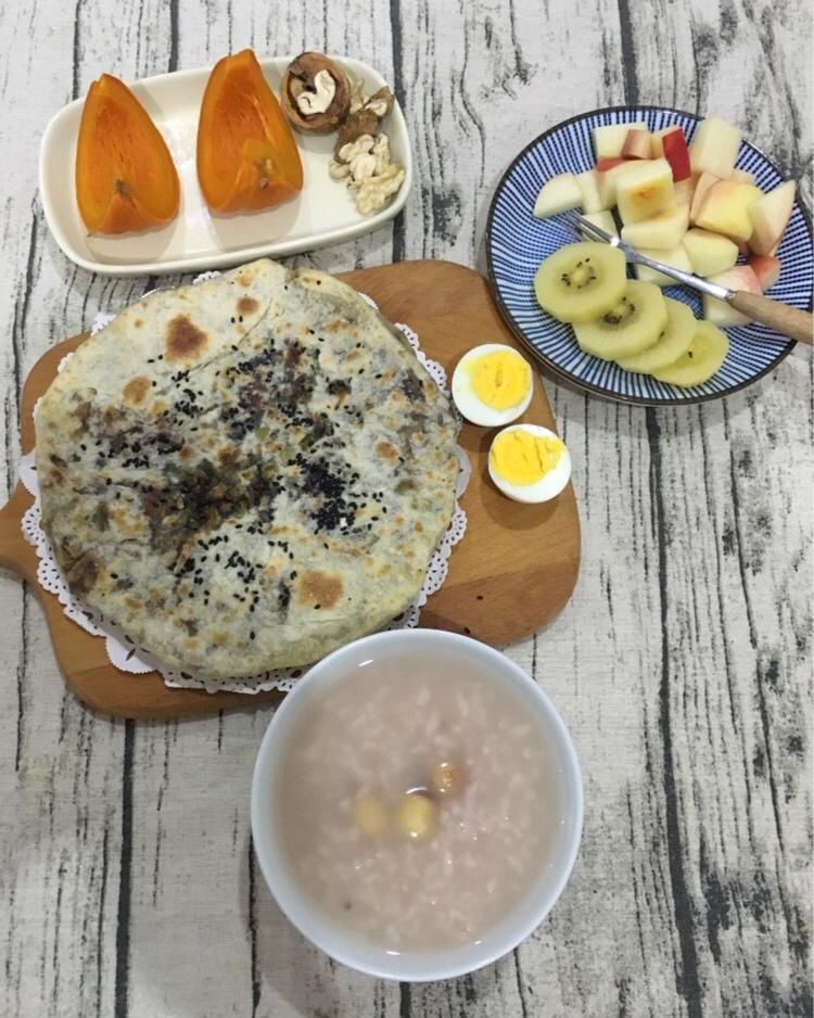 早餐:梅干菜猪肉烧饼,莲子粥,鸡蛋,南瓜,水果+...