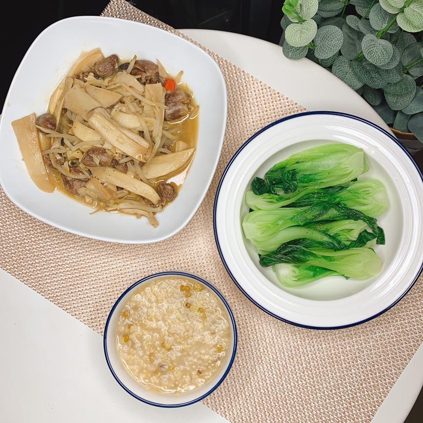 鸡心和剩下的杏鲍菇豆芽炒了一下。主食改成了绿豆粥。豆腐中午吃了。