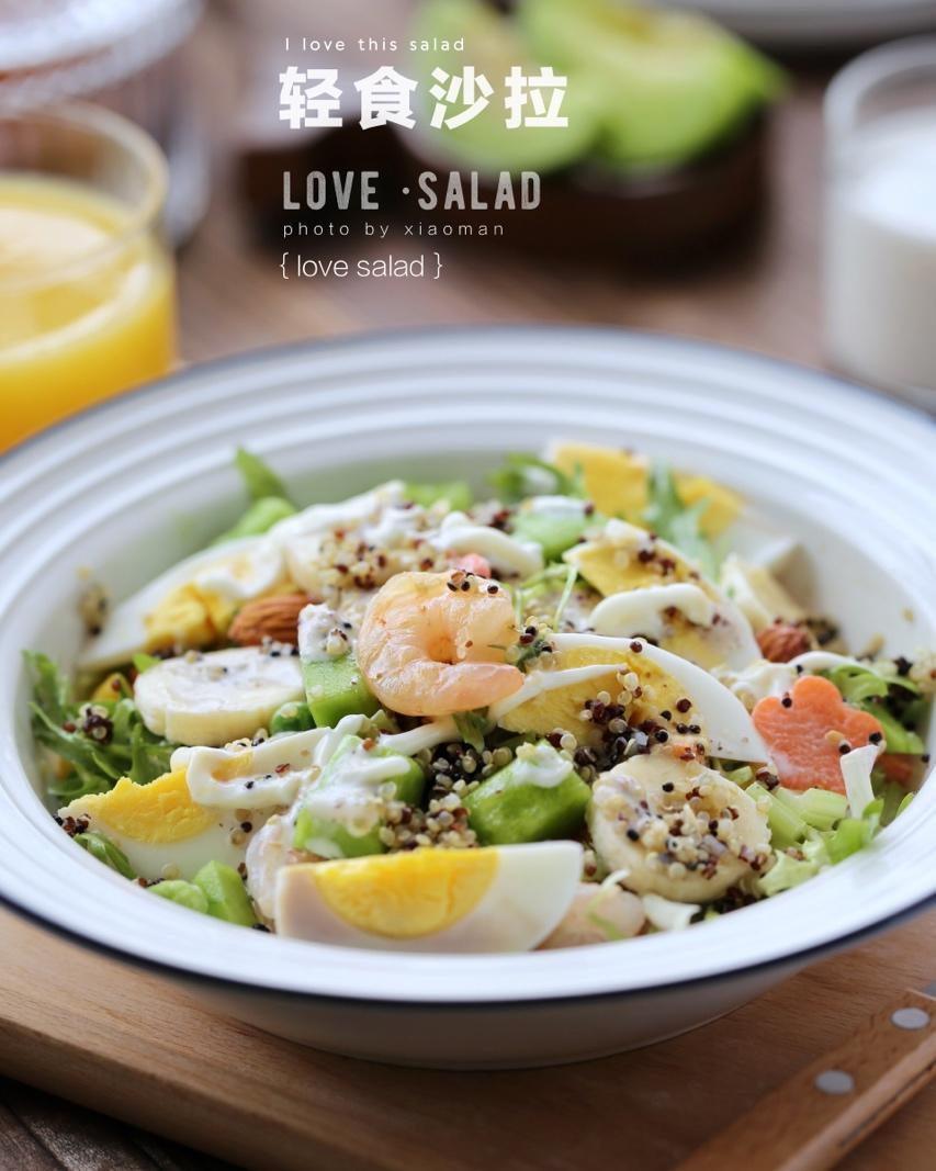 第464天早餐:藜麦轻食沙拉+紫苏藜麦饭团+鲜榨橙汁+绿甜宝