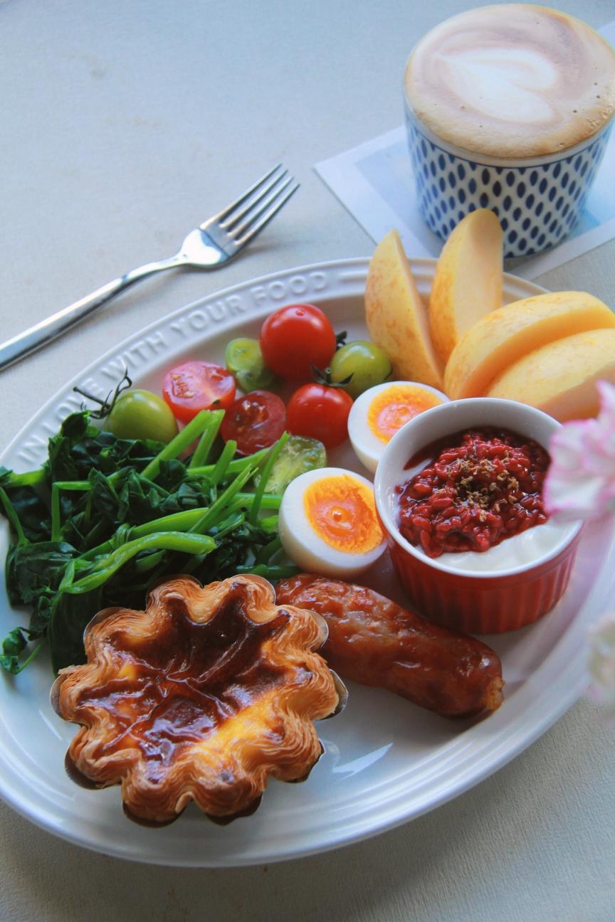 今日份早餐:玫瑰千层饼、鸳鸯包、水煮蛋、煎培根、草莓、珍珠枣、酸奶、拿铁~
