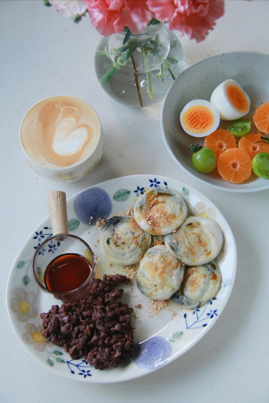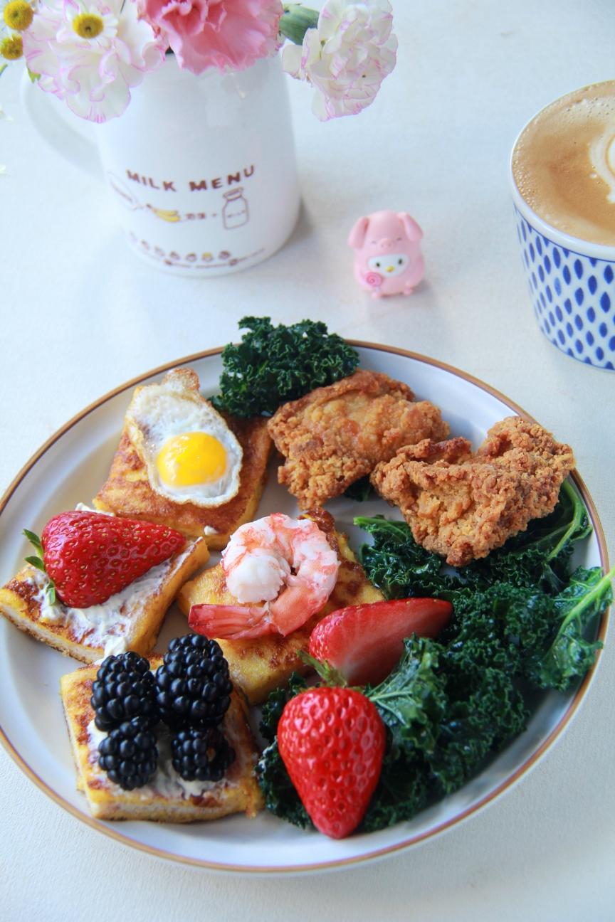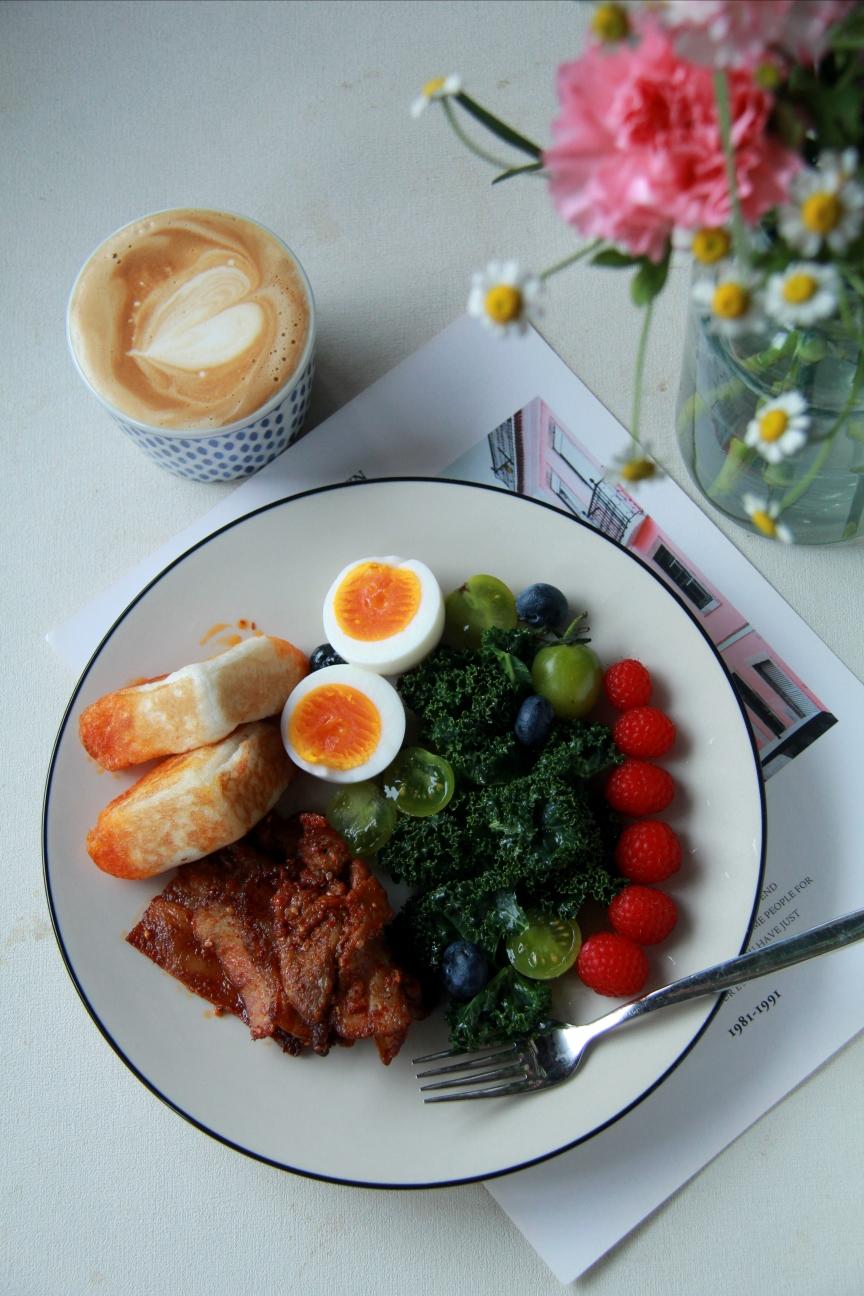 今日份早餐:三角粑、水煮蛋、烤五花肉、羽衣甘蓝、小番茄、树莓、蓝莓、拿铁~