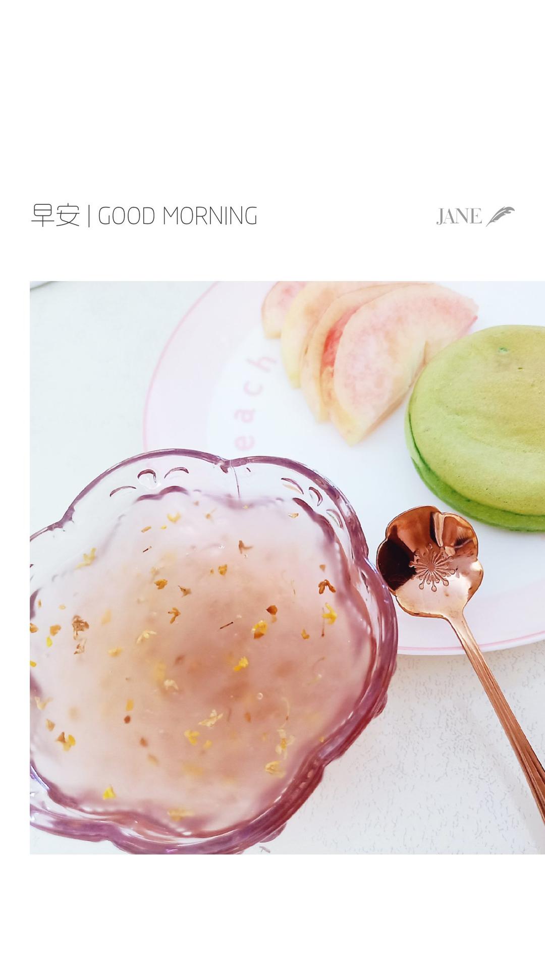 加了点桂花干的纯藕粉,紫米馅大麦苗车轮饼,水蜜桃