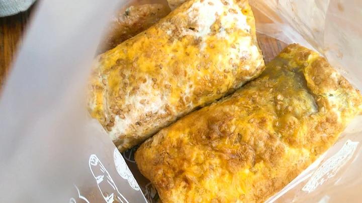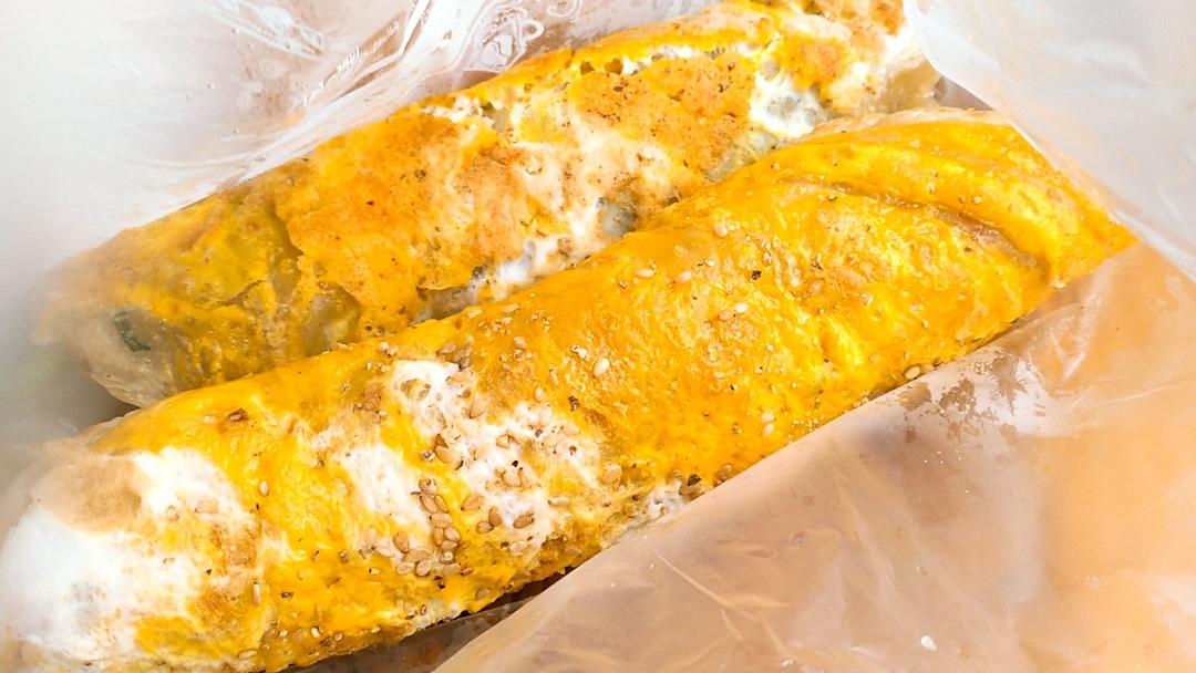 他说感觉煎蛋粘在饼皮上会更好吃点