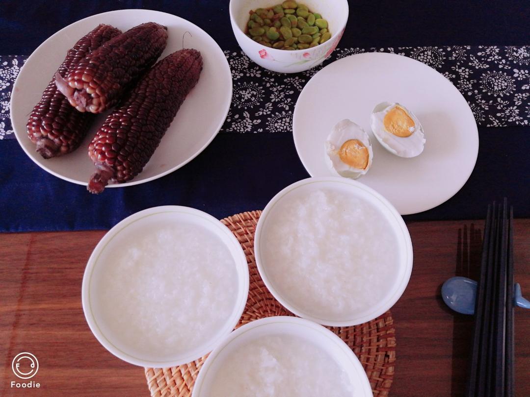 早安,我们仨的早餐,玉米,腌毛豆,咸蛋没油。奢求往后