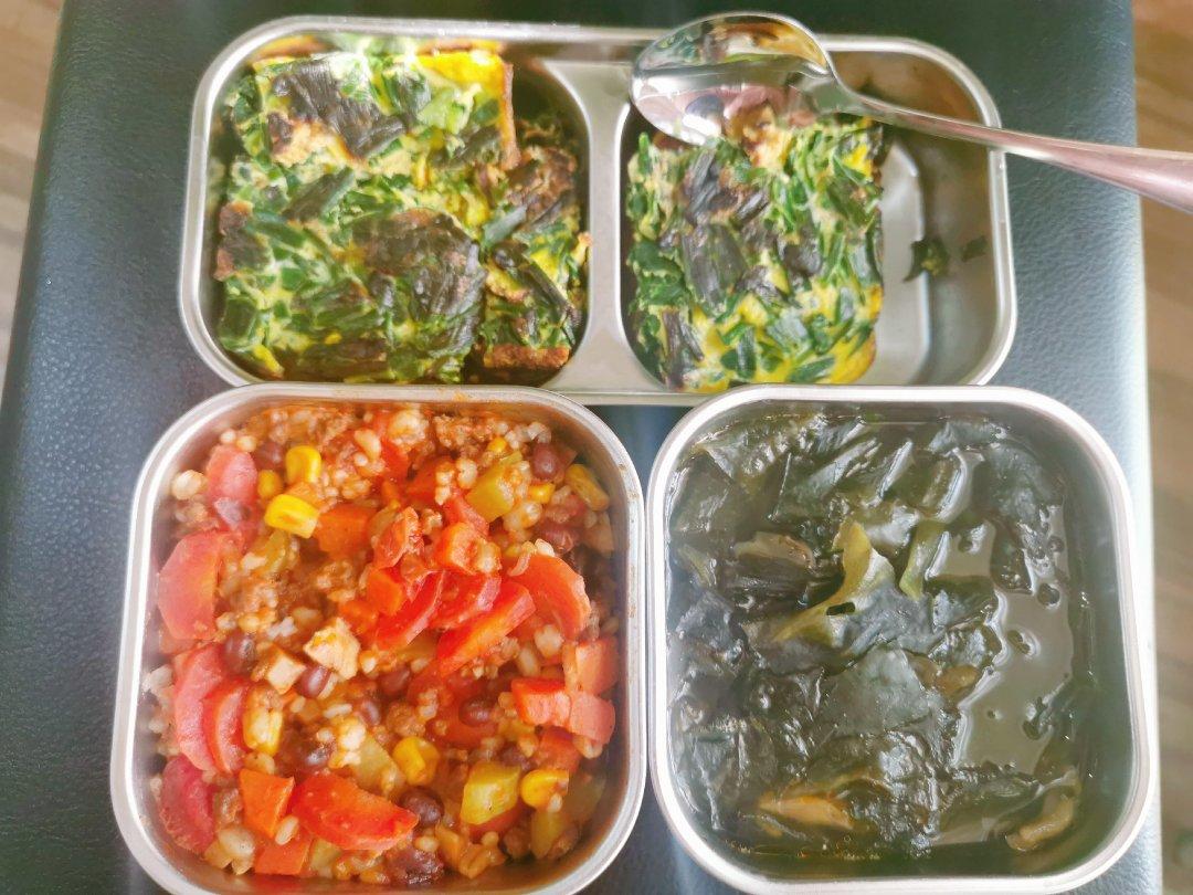 番茄蘑菇牛肉酱烩雜蔬红豆杂粮饭+海带芽蘑菇鸡肉汤+鸡蛋韭菜饼+西兰花鸡肉蛋饼