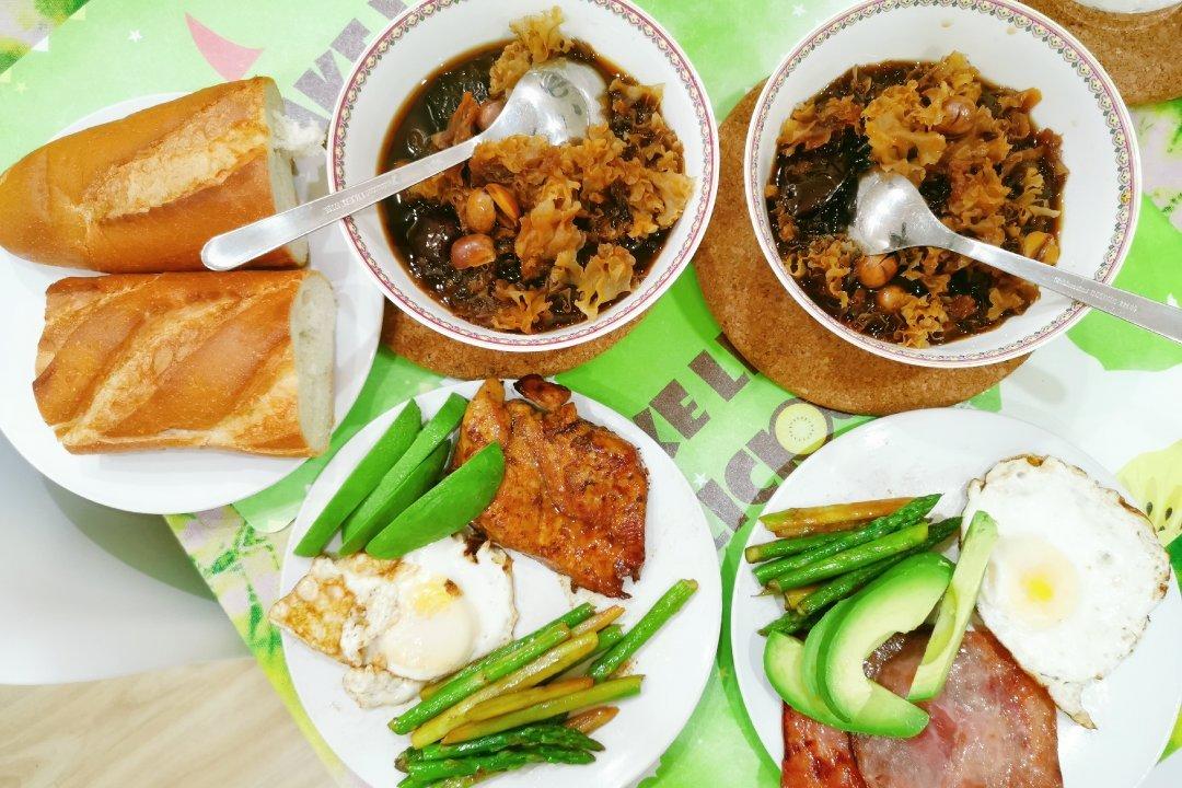 法棍鸡胸(火腿)鸡蛋牛油果配芦笋+红枣银耳汤。
