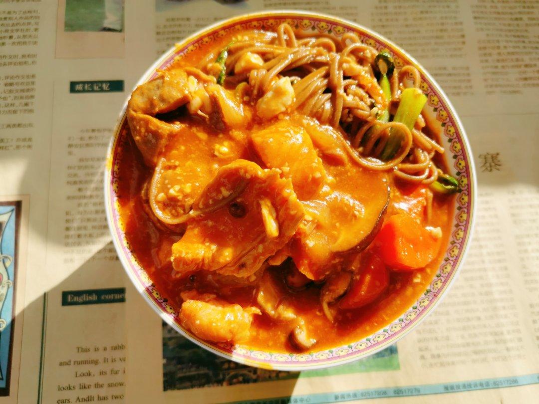 有阳光的地方拍照真是美吖!番茄牛肉丸子的底汤下点鸡肉荞麦面和鸡毛菜,又是美美的一大碗,超级快手方便,就是不方便带#午餐•...