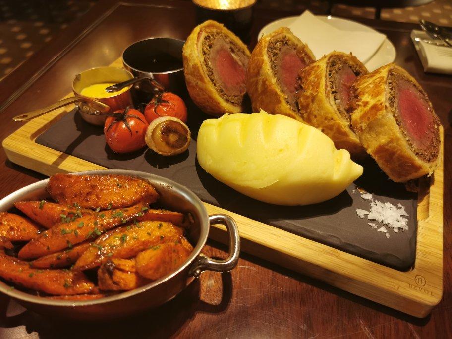 在戈登的店吃到了惠灵顿牛排,中间三分熟的牛里脊,裹一层蘑菇酱和培根,最外面是一层酥皮。一共给切了四块...