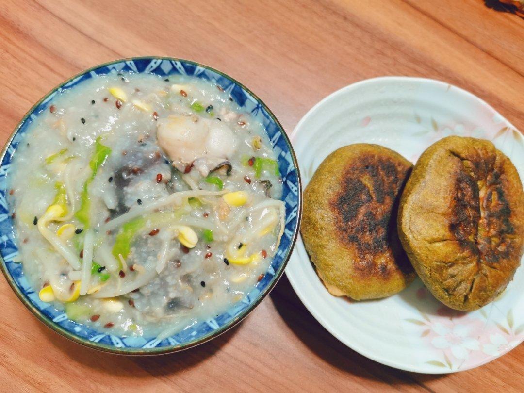 今日早餐:那天做墨西哥卷饼的面做的虾蓉菠菜饼,配...